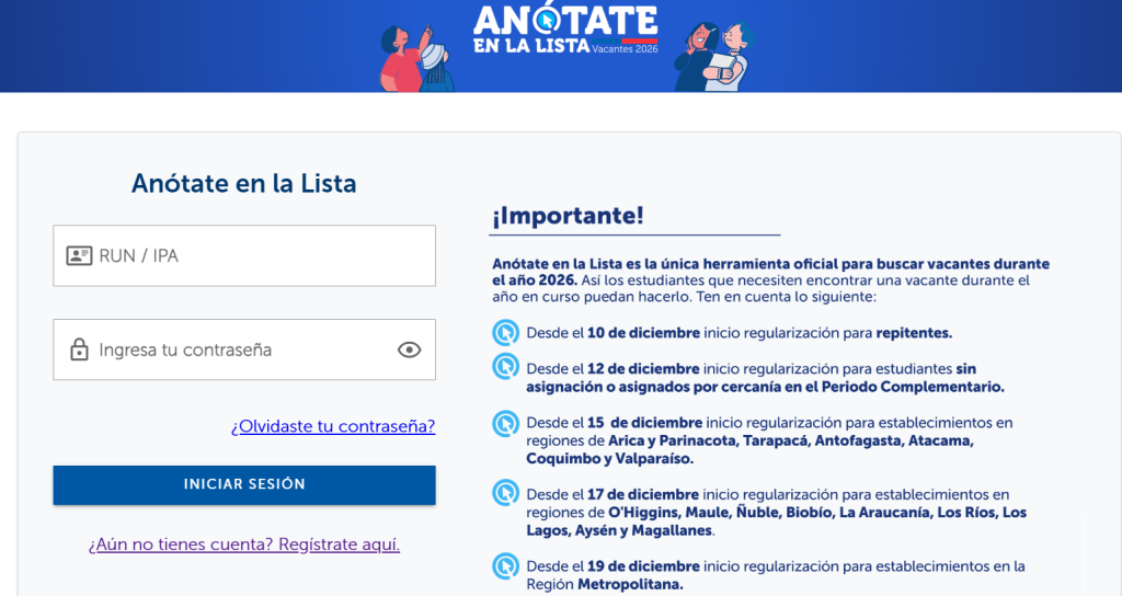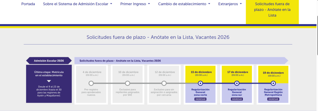 Si quedaste fuera de proceso regular y necesitas vacantes para el año 2026 debes ingresar a Sistema de Admisión Escolar y seguir los pasos